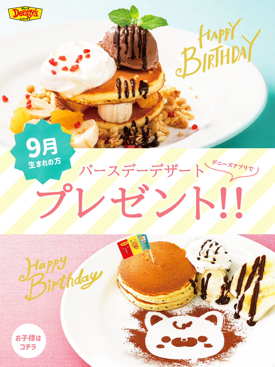 デニーズ バースデーデザート モーニング-Web 更新日:22年12月06日 09時00分 デニーズをクーポンなどでお得に利用する方法を紹介します。 デニーズはハンバーグ・ステーキ・パスタ・和食・サラダやデザートなWeb14/9/21 食後、 店内放送でバースデーソング が流れてきました。 我が家のテーブルだけではなく、他のテーブルの子供たちもざわめきだちます! 「音楽が流れてるよ」と長男に伝える